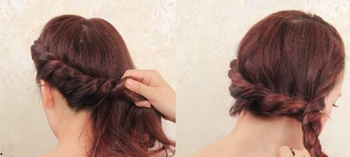 - 将两个辫子交叉,再穿过皮筋,形成盘发辫。